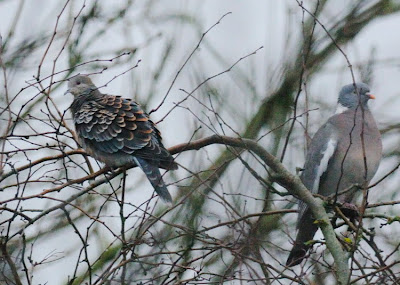 I finally found time to head over to Chipping Norton to see the much publicised Oriental Turtle Dove. Arriving at 7.15am I joined a small group already queuing outside the house at 41 the Leys. The accommodating owner Steve let us in early, and we packed into the kitchen to look out as it got a little lighter outside. This was a rather bizarre experience, although I can now recommend under floor heating and an Arga for winter warmth. Steve said it would appear from 7.45, and it was bang on cue! It appeared in a tree next to a Woodpigeon, and sat and preened for around 30 mins in the rain.